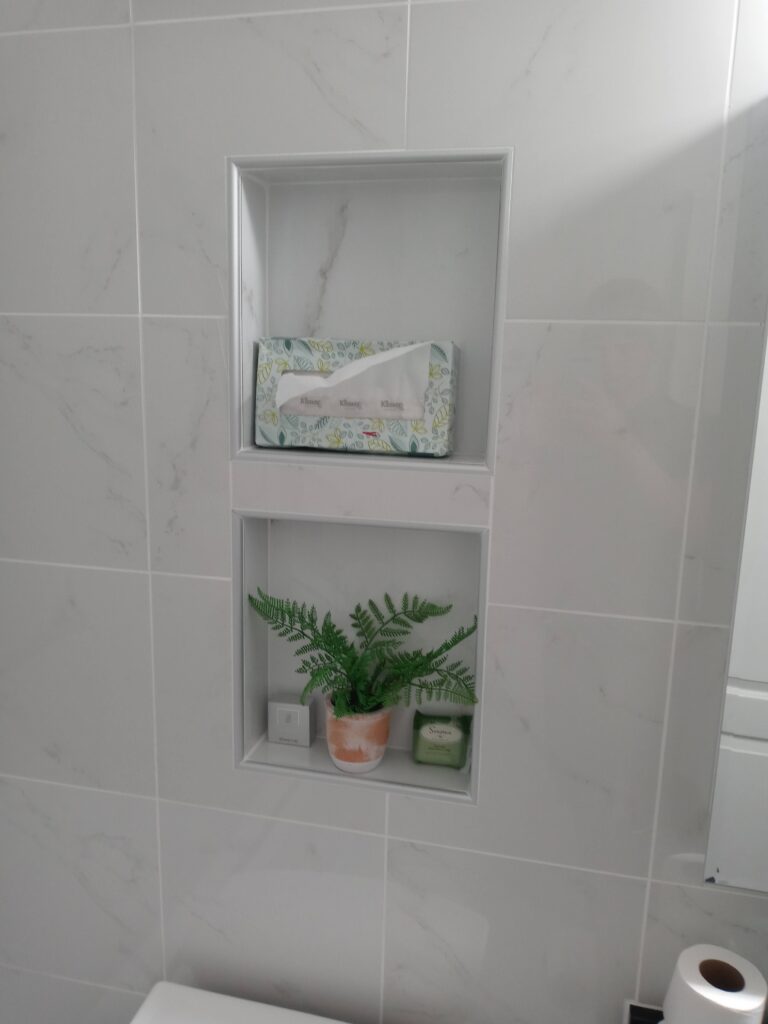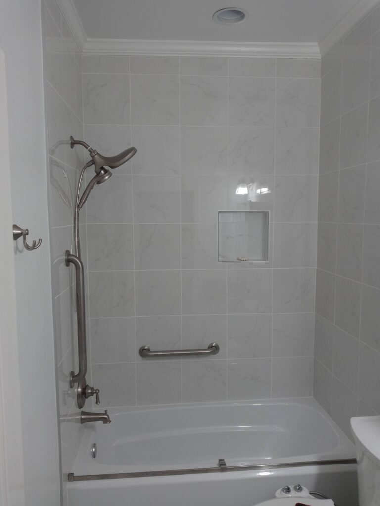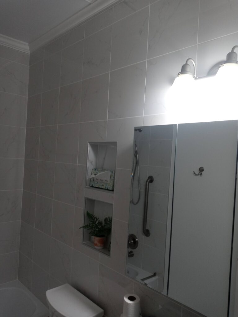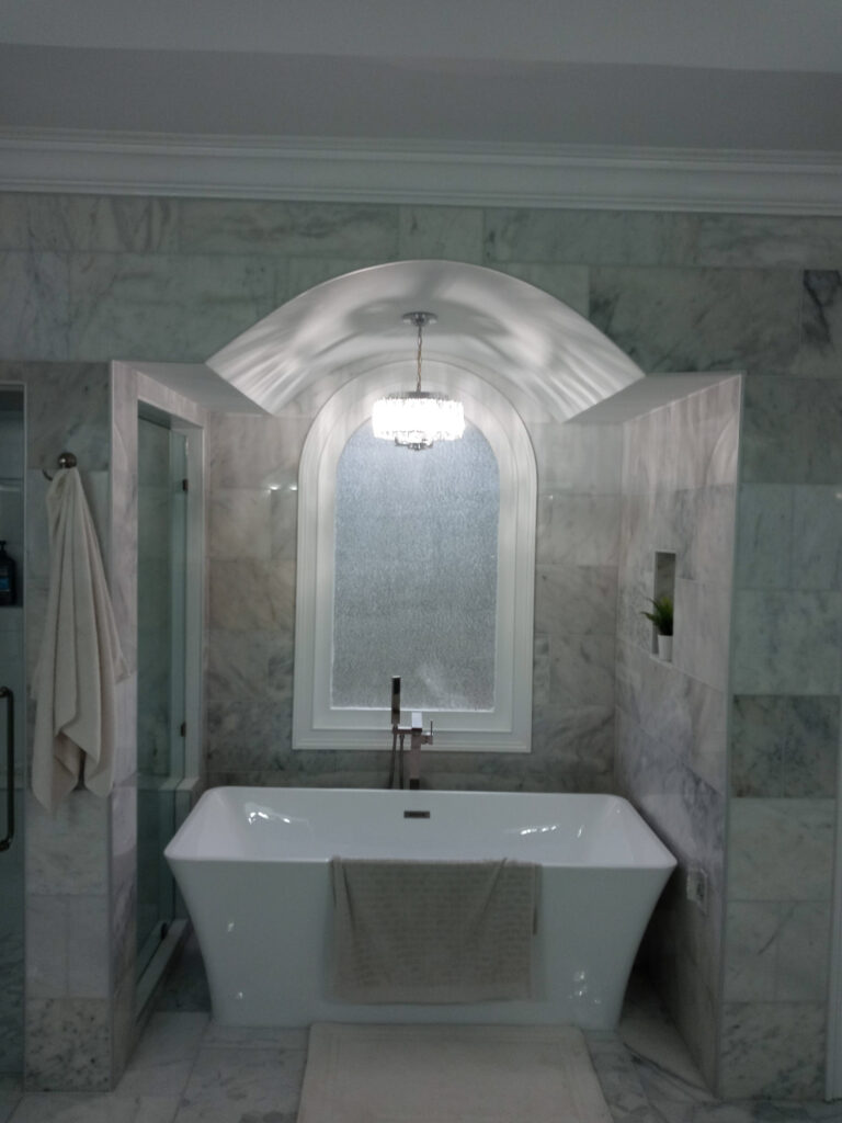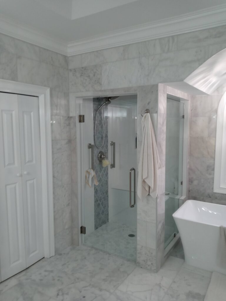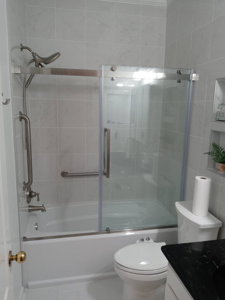 The next step was the installation of a new shower with tempered glass doors and ceramic tiles. A freestanding bathtub was placed, creating a stylish focal point in the bathroom.