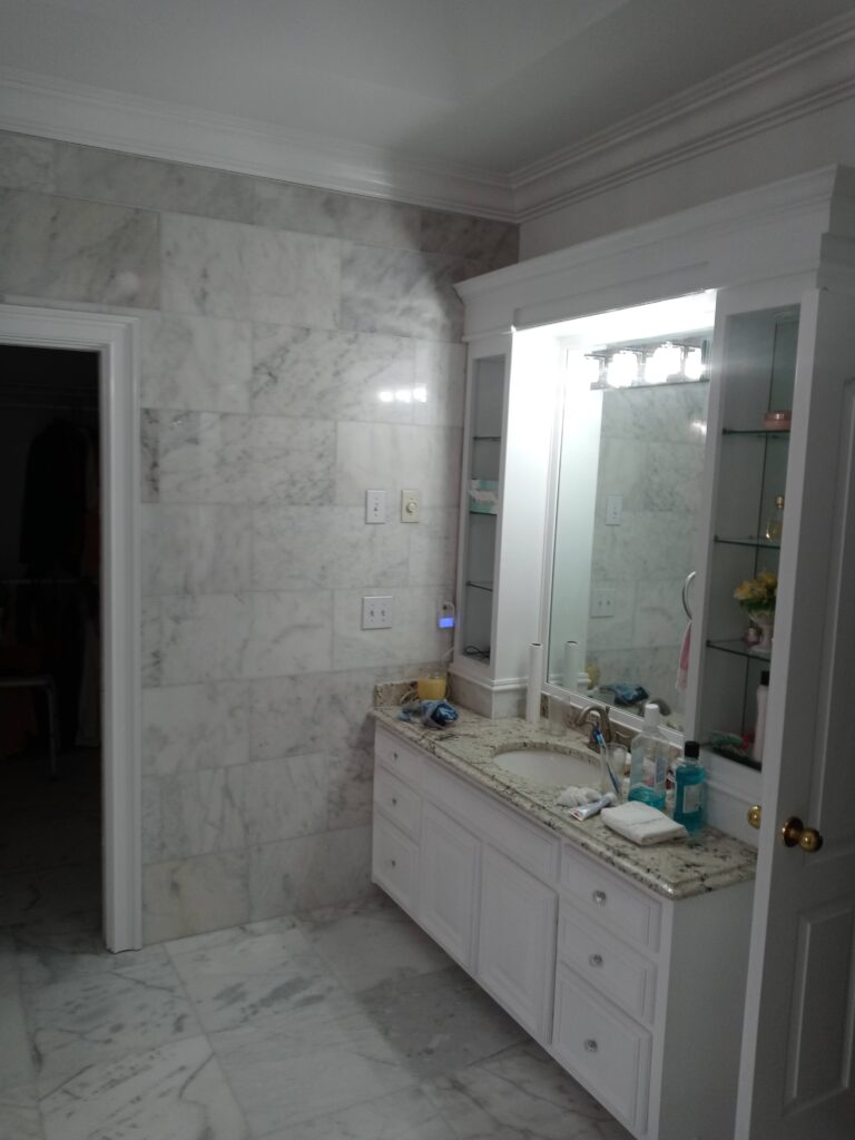 Modern bathroom furniture was installed, including a double vanity with granite countertops and built-in sinks. Mirrors with integrated LED lighting and a dimmable lighting system were added to create a relaxing atmosphere.
