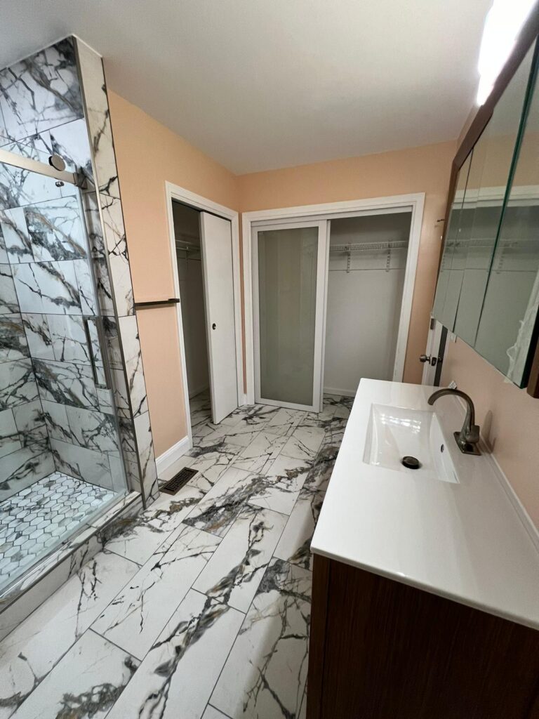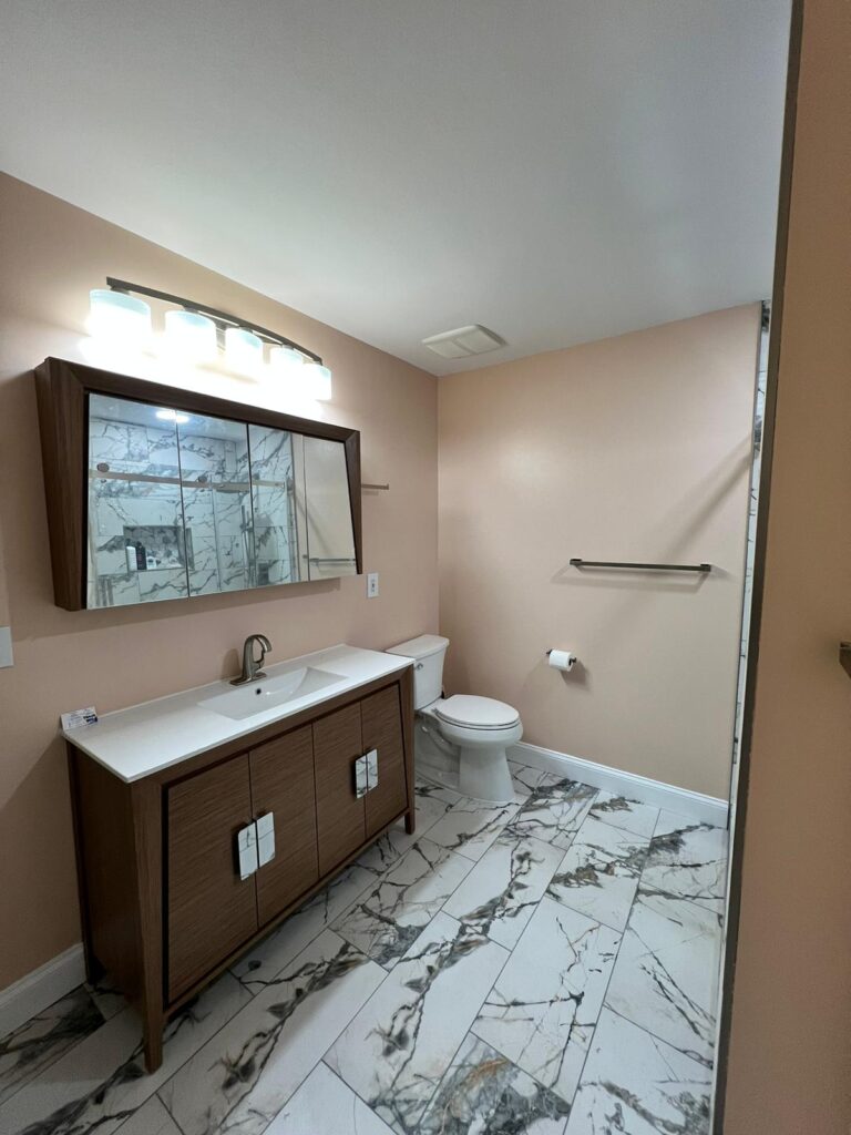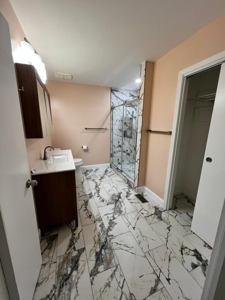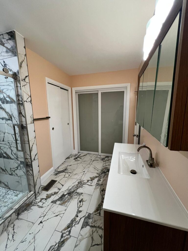 Glass shower door: A sleek glass shower door was installed, adding a contemporary touch and visually opening up the space. Sliding closet doors: Sliding doors were added to the bathroom closet, optimizing space and facilitating its use. Sink Cabinet: For the sink cabinet, a modification was made to the back to properly fit the existing plumbing. This allowed for a clean and precise installation of the sink and corresponding mirror. Toilet: The new toilet was also installed, completing the functionality of the bathroom.