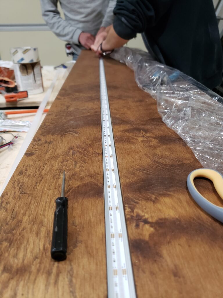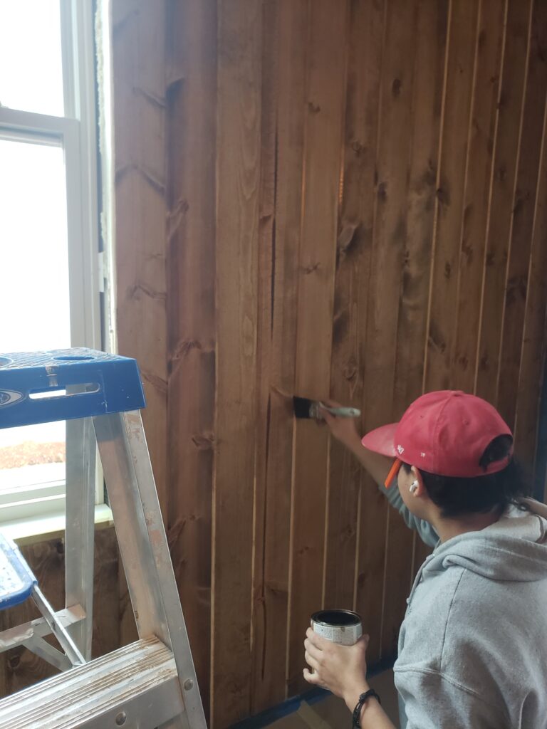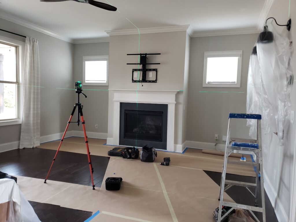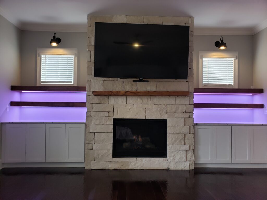 Fireplace With all the elements approved and in order, we began the work with the demolition phase, removing the old drywall from the fireplace. We use a laser level to take precise measurements and ensure everything is level and perfectly square. For the floating shelves, we manufacture exclusive models from the R&LV brand with high-quality wood, in which we install colored lights controlled by a remote control fixed to the wall. To finish the shelves, we advised the client in choosing a stain that would harmonize with the general design.