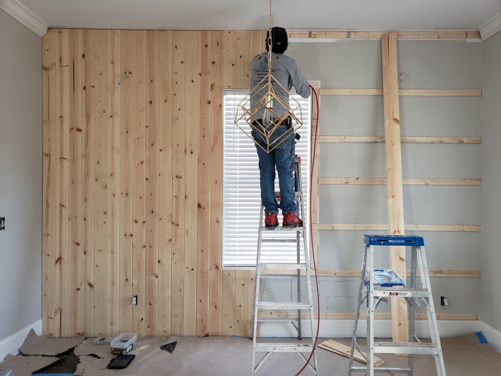 Wall Design The wall design required a special selection of wood, which we prepared in advance with the necessary electrical adjustments. The client chose a suitable stain for the wood finish, and lights were integrated to give life to the space. The result was a creative and elegant wall, perfectly combined with the rest of the decoration.