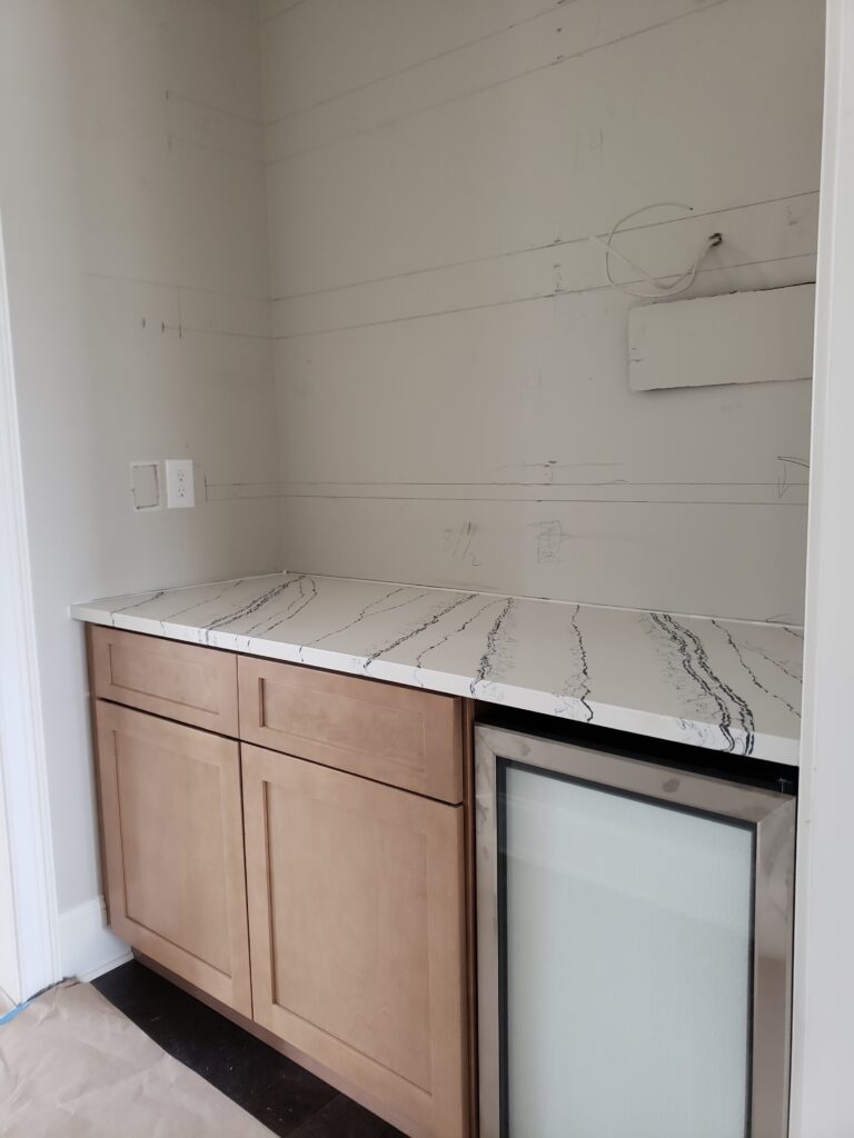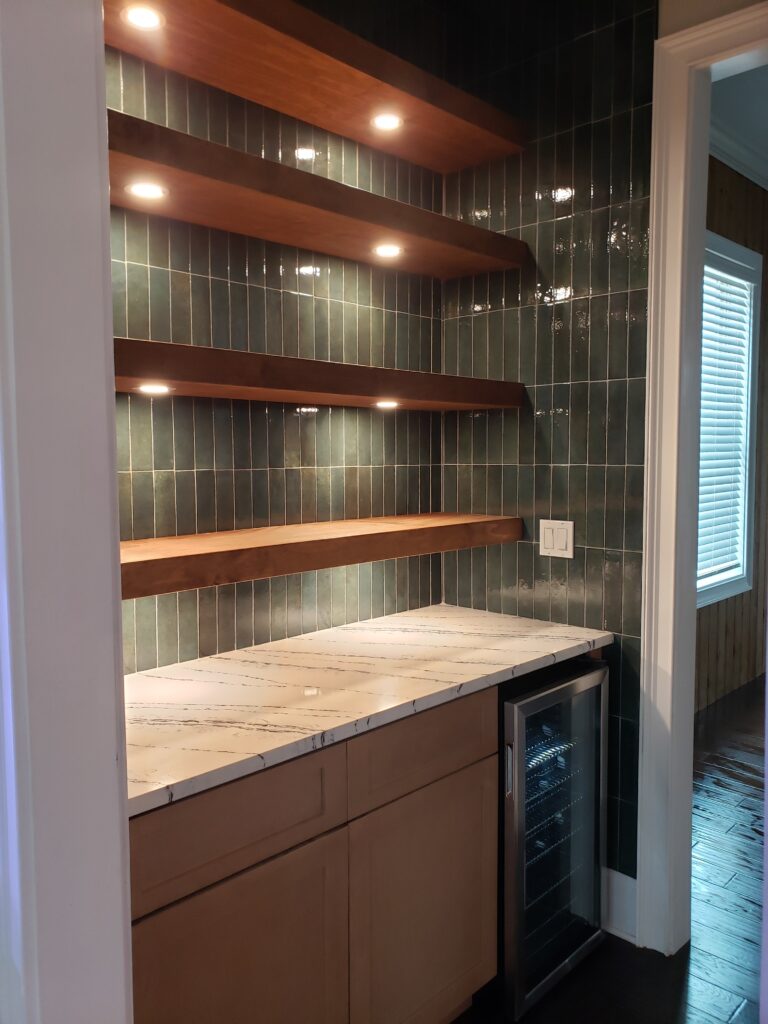 Minibar For the wet bar, we installed a unique backsplash, custom cabinetry, and quartz slab top. R&LV brand floating shelves and a small built-in refrigerator were also added. Electrical adjustments completed the space, making it a transitional, functional and modern minibar.