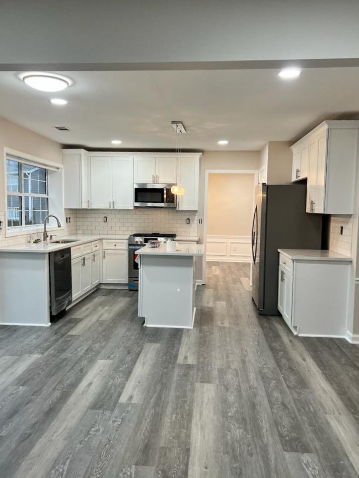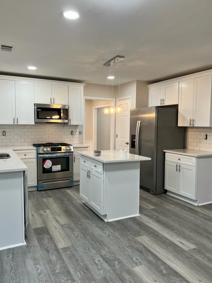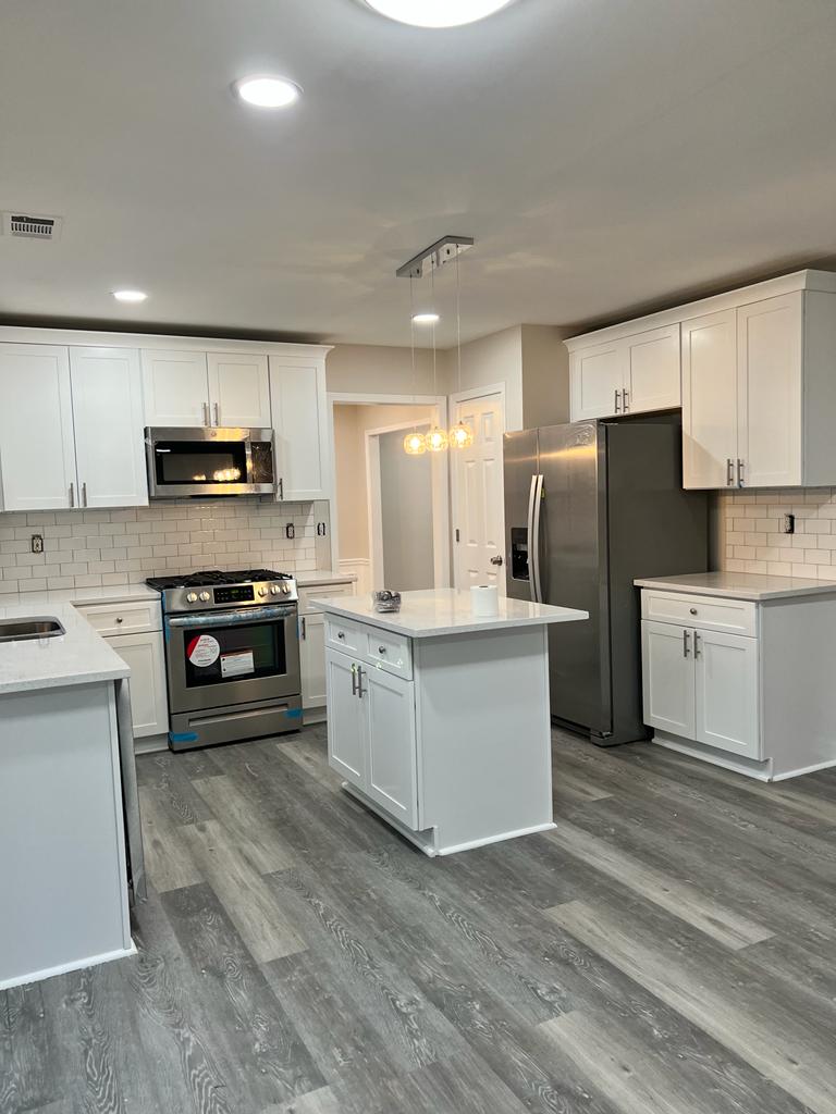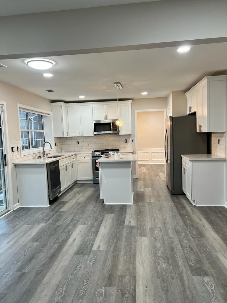 We recently completed a comprehensive remodeling project at a residence, encompassing significant improvements to several key areas of the home. In the kitchen, major renovations were made to the kitchen with the installation of a new stepped backsplash that introduces a vibrant modern style to the space. The granite countertops were selected for their durability and elegance, perfectly complementing the new custom cabinets, maximizing storage space and providing a fresh, contemporary look.